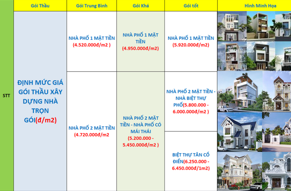 Xây nhà trọn gói phần thô: Đơn giá xây dựng từ 2.500.000 – 3.950.000 đ/m2 sàn xây dựng.