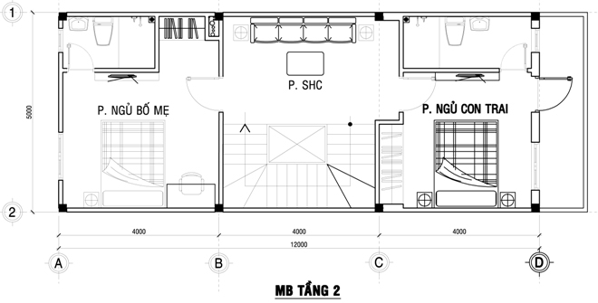 Bản vẽ thiết kế mặt bằng tầng 2 nhà phố 80m2