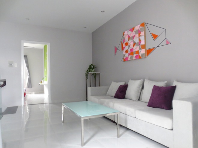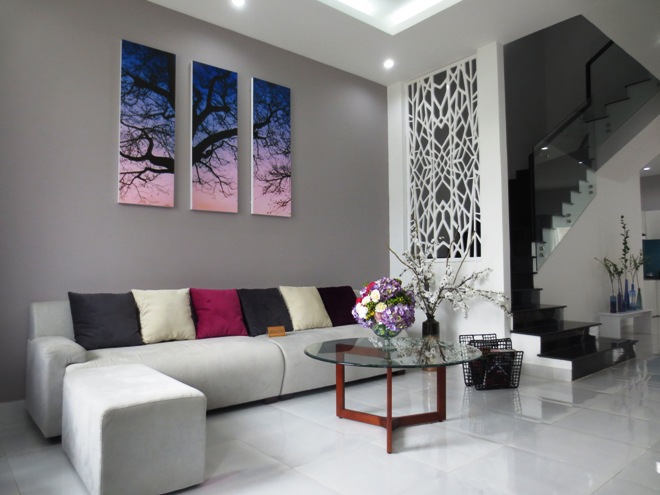 Bạn có thể thấy sự tinh tế của gia chủ qua cách bài trí nội thất phòng khách với bàn kính tròn, ghế sofa có cùng tông màu với màu sơn tường. Để căn phòng có thêm sinh khí, tránh sự nhàm chán, những chiếc gối tựa lưng nhiều màu sắc cùng tranh treo tường trở thành điểm nhấn giúp không gian thêm nổi bật.