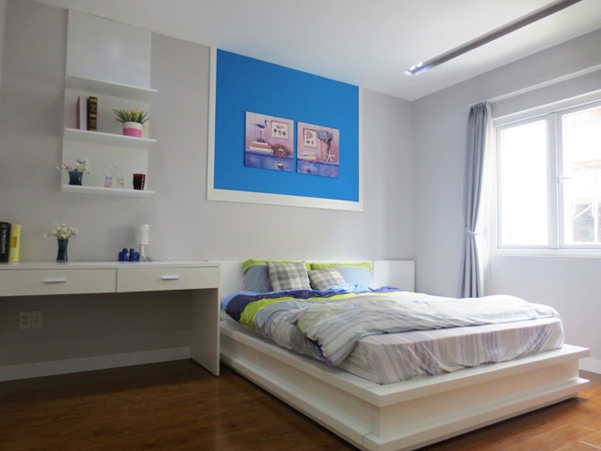 Phòng ngủ của bố mẹ được cách điệu cùng mảng tường đầu giường sơn tím, điều này giúp thổi bừng sức sống cho căn phòng, cũng như tạo sự lãng mạn cho không gian riêng của hai vợ chồng.