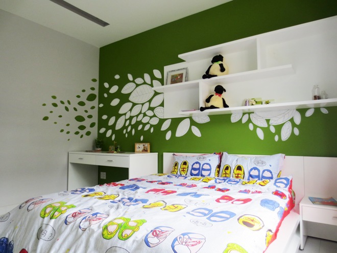 Phòng ngủ của bé gái với màu xanh lá cây và họa tiết hoạt hình ngộ nghĩnh trên chăn, ga, gối. Hệ tủ lưu trữ được bố trí cùng góc học tập ngay đầu giường đầy tiện lợi cho bé.
