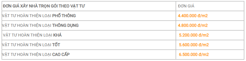 II. Đơn giá xây dựng nhà trọn gói theo vật tư 2020