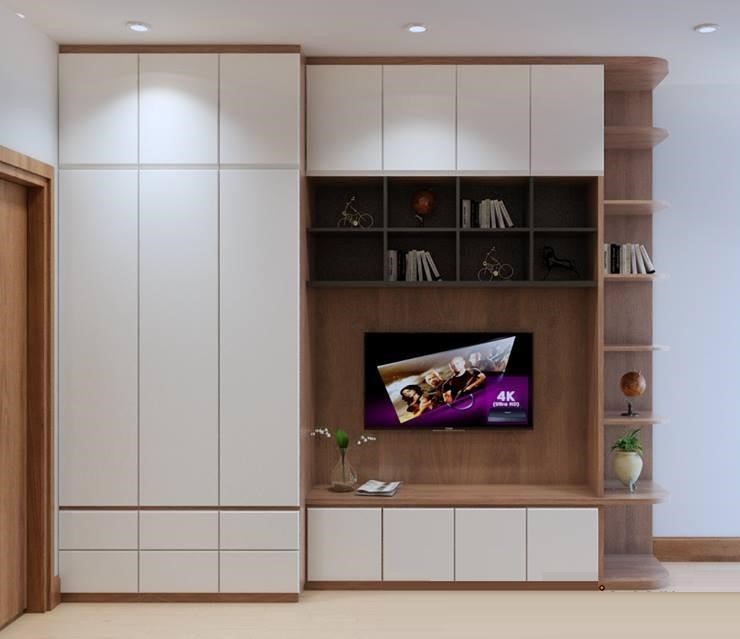 Tủ quần áo gỗ ép thiết kế kệ treo TV rất ấn tượng, thu hút mà vẫn giữ được nét gọn gàng cho căn phòng.